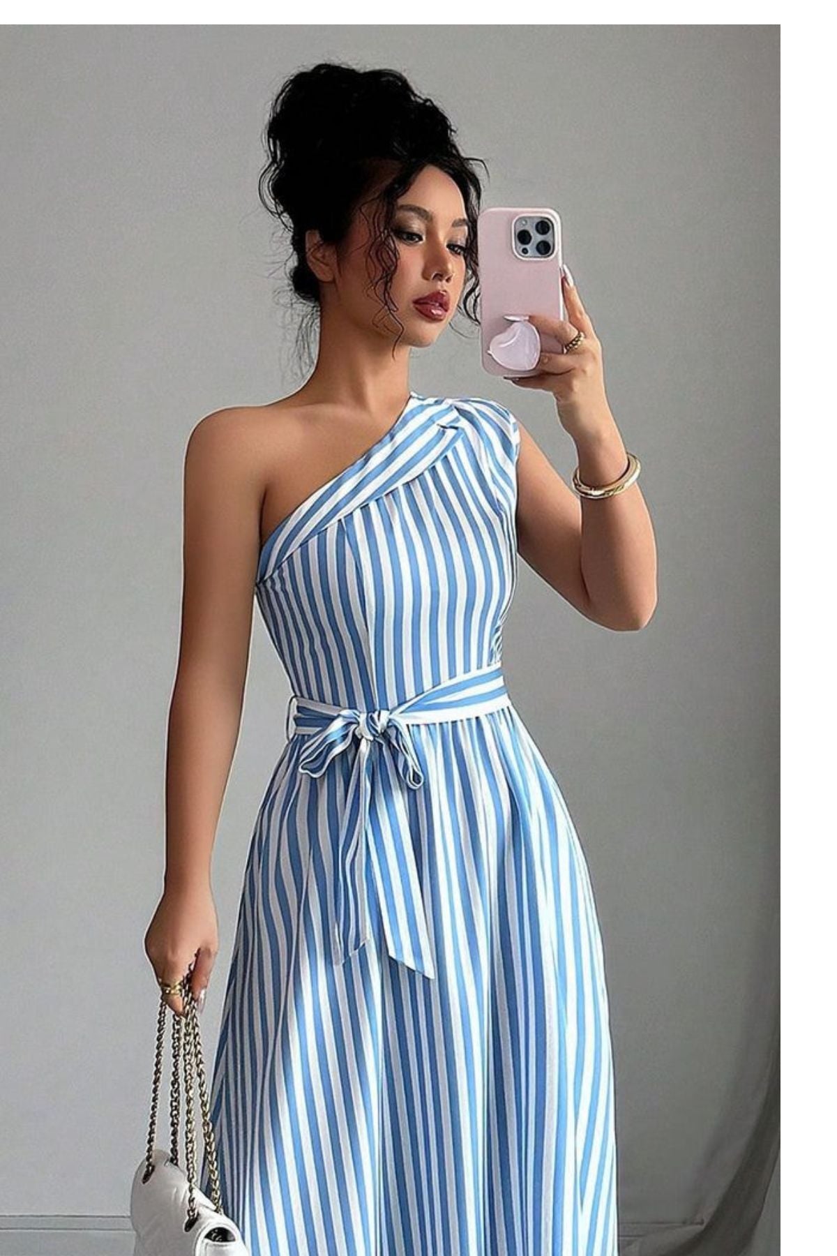 Step into effortless elegance with the Serene Stripes Maxi Dress. Designed in soothing blue-white vertical stripes, this one-shoulder silhouette flatters every curve while offering a breezy, lightweight feel. Perfect for brunches, beach getaways, and chic daytime outings.