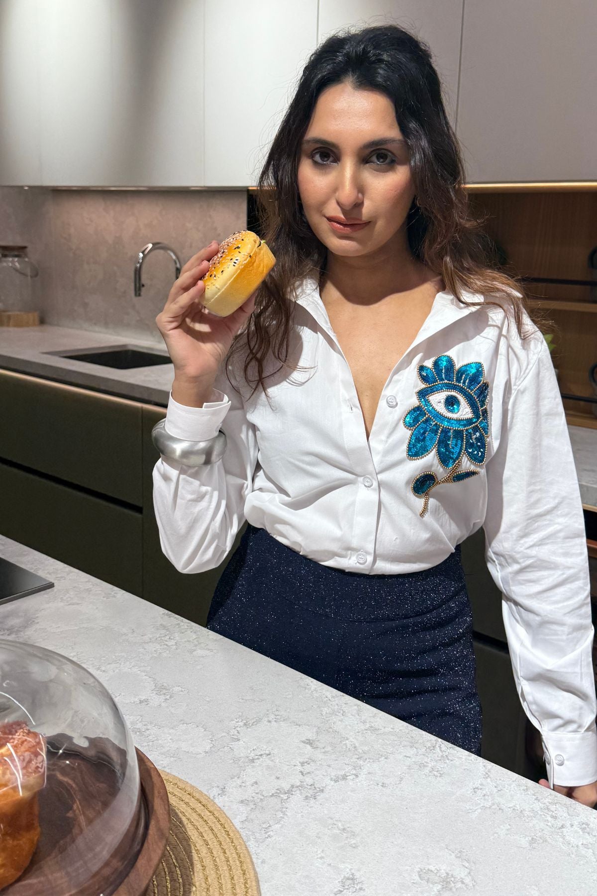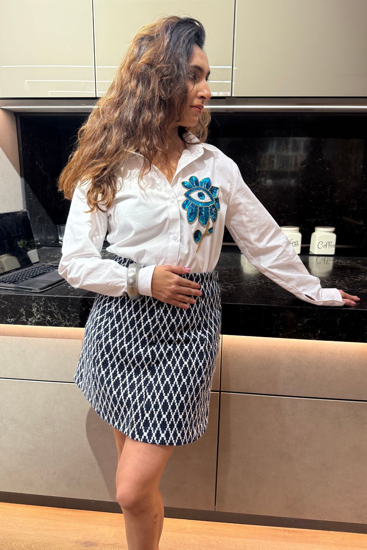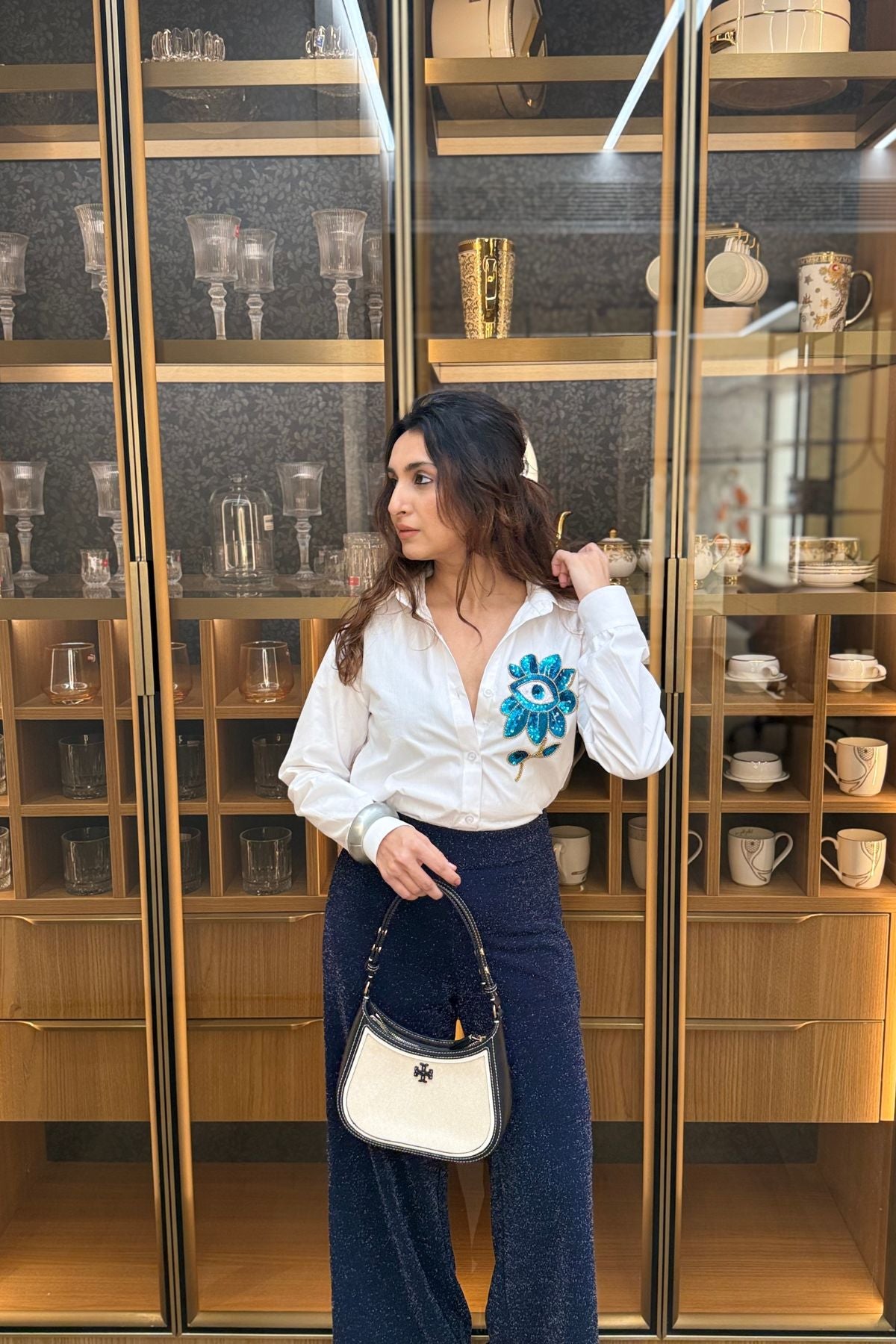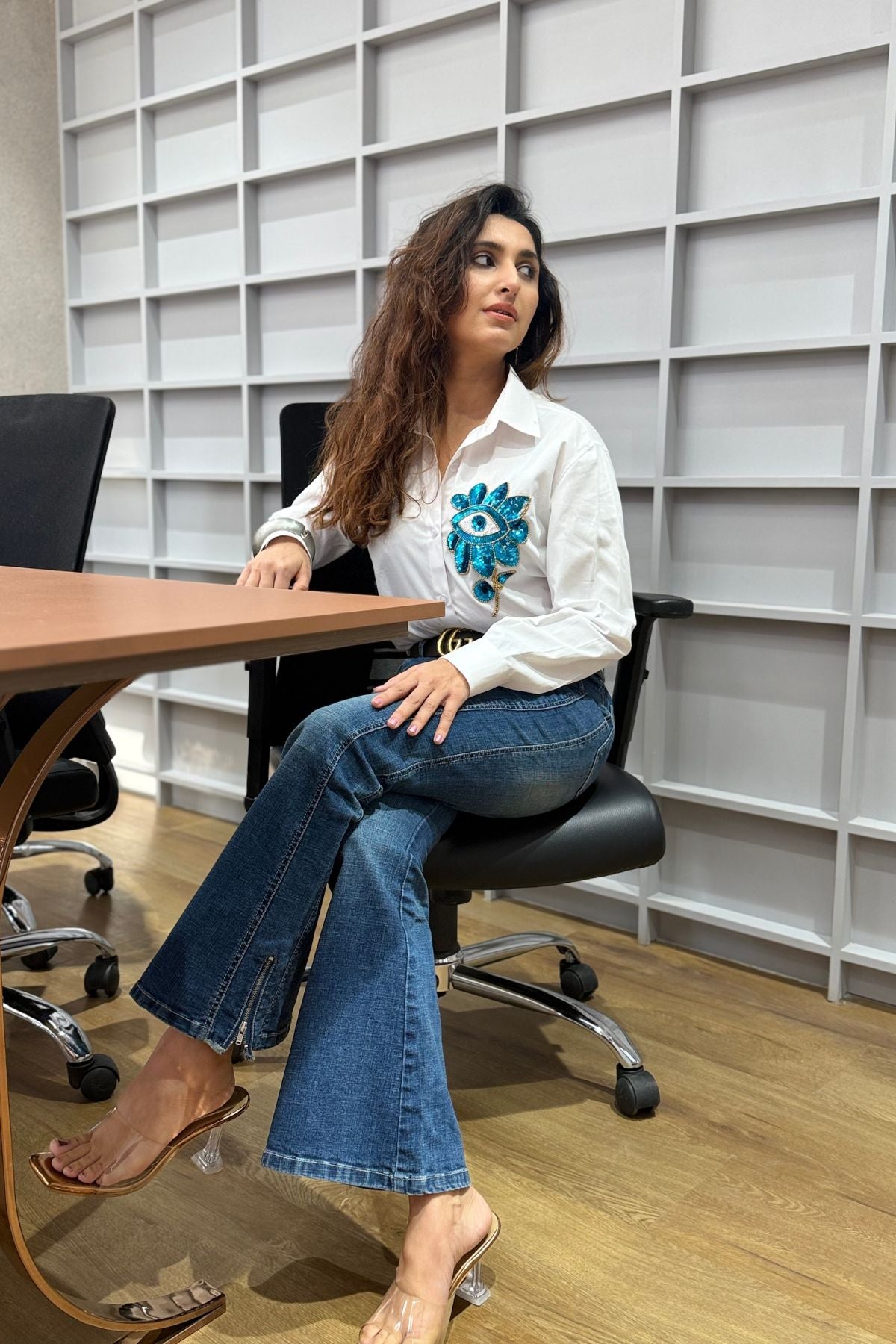 Introducing White Gaze Shirt  — a timeless white cotton shirt elevated with a handcrafted Evil Eye sequin motif. Made in ultra-soft premium cotton, it blends breathable comfort with a hint of luxe shimmer.