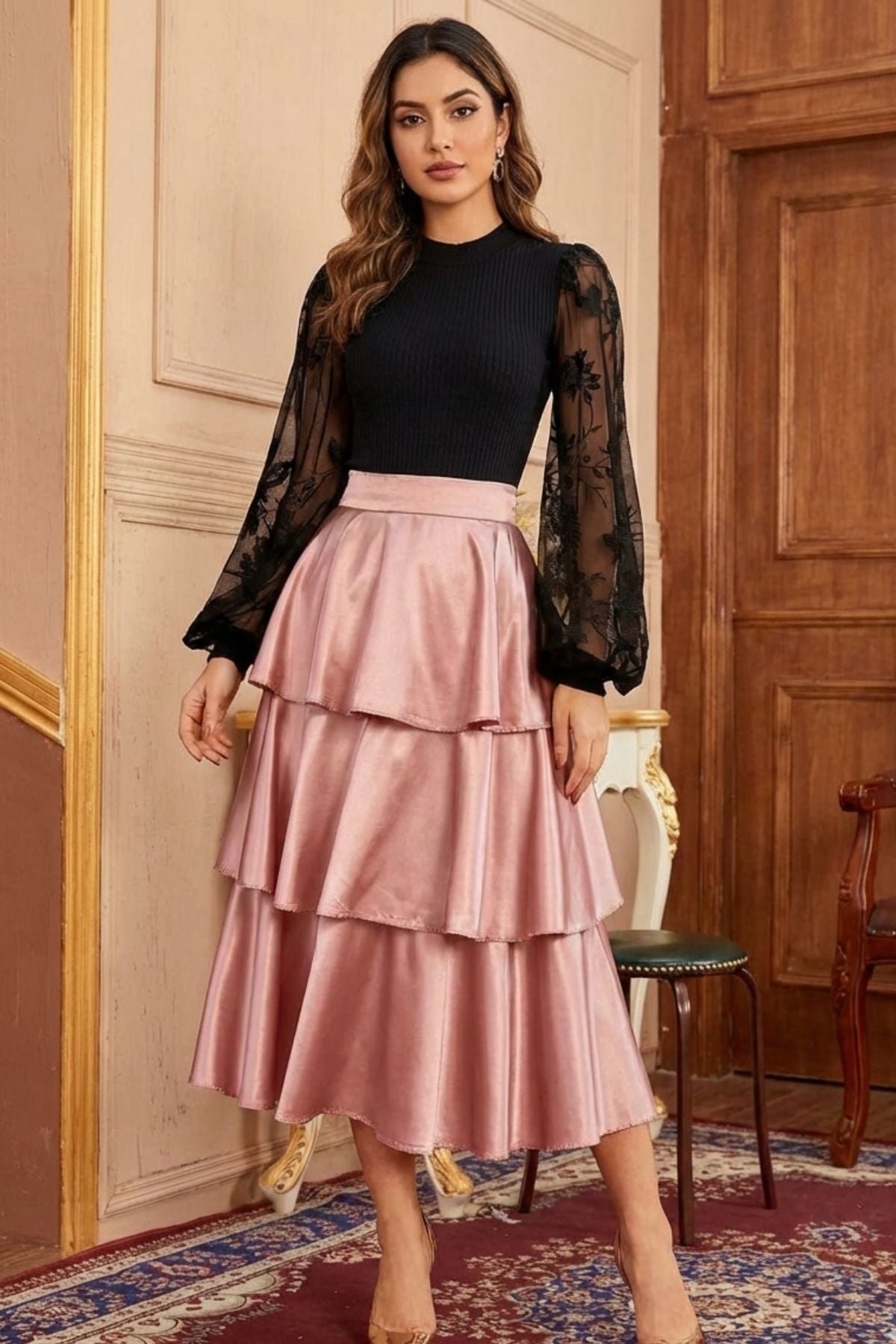 Soft, feminine, and effortlessly elegant — the Rose Glow Ruffle Skirt is designed to add a touch of romance to your wardrobe. Crafted in a lustrous satin finish, this skirt features a flattering high-waist fit with cascading ruffle detailing that creates graceful movement with every step. The delicate rose-blush hue makes it perfect for parties, festive gatherings, and elegant day-to-evening styling.