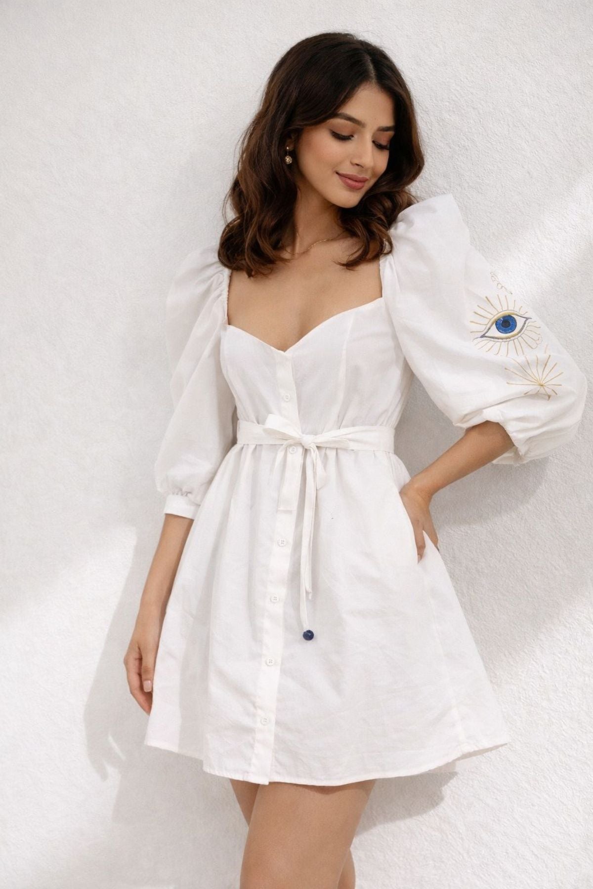 A delicate evil eye embroidery on the sleeve with subtle golden accents adds a unique statement detail. The dress also features decorative front buttons for styling and comes with a matching same-fabric belt to cinch the waist for a flattering fit.